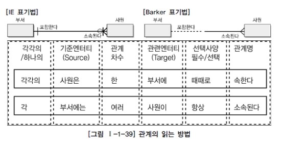 - 존재 관계 : 엔터티 간의 상태. ex. 포함한다, 소속된다.